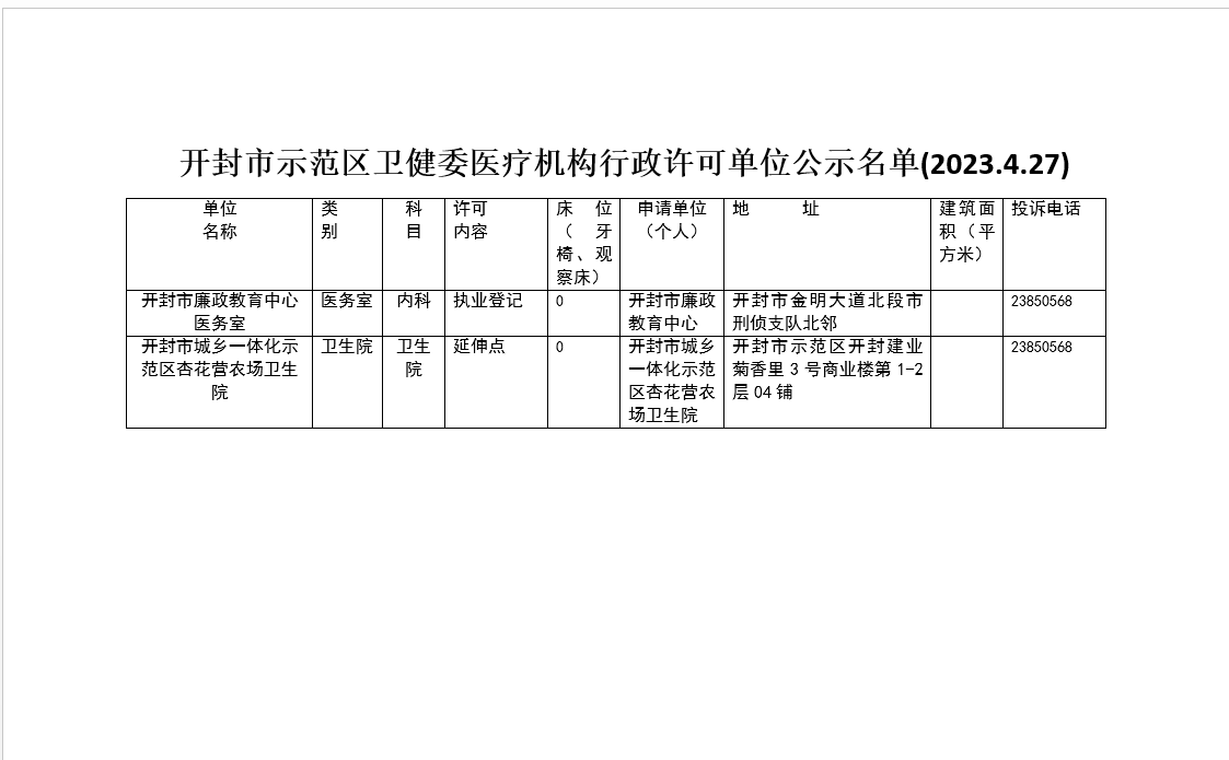 开封市示范区卫健委医疗机构行政许可单位公示名单(2023.4.27)
