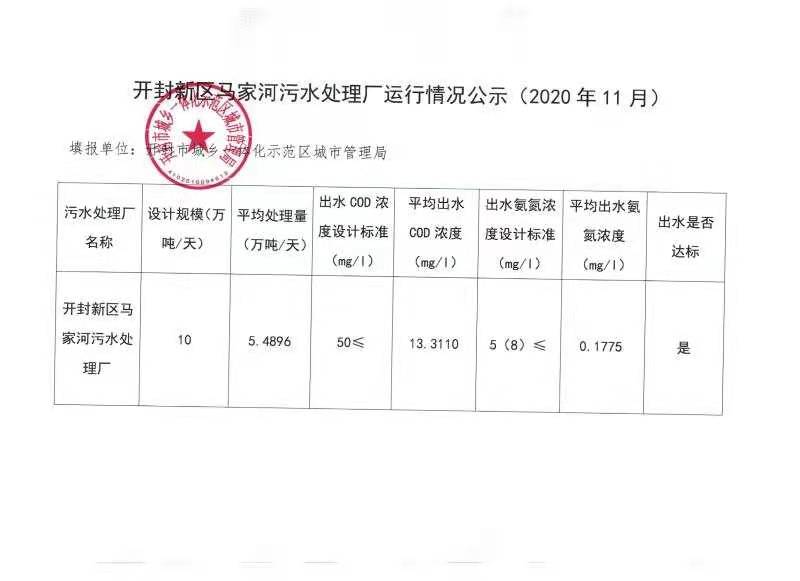 开封新区马家河污水处理厂运行情况公示(2020年11月)