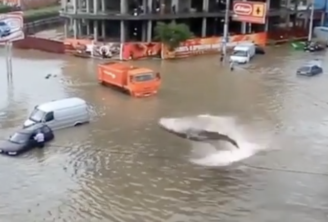 网传视频实际发生地点在国外,上传时间为去年,视频中翻腾的“座头鲸”是艺术合成的。 20日晚间,社交媒体上流传一则4秒钟的短视频,显示一条巨大的鱼状物体在街区洪水中翻腾,据称是郑州“荥阳海洋馆被冲破,海洋馆鲨鱼逃出来”。 经查证,该说法不实。通过反查图片可知,该视频并非新发,而是来自国外社交媒体。原视频一共6秒,被裁掉的2秒清楚显示视频发生地使用的是俄语,查询图中电话号码也可以确认所在地是俄罗斯,且视频上传时间为去年底,与郑州本次暴雨毫无关系。 另外,目前也没有任何消息显示郑州有海洋馆被洪水冲破。该消息纯属谣言。 所谓鳄鱼的视频、图片发生地均在国外,与本次郑州暴雨毫无关系。 20日夜间,除了“郑州海洋馆的鲨鱼跑出来了”的视频在网上流传外,还流传着“鳄鱼也从海洋馆出来了”的说法,也配了一条视频,画面显示一条鳄鱼正咬着一具疑似女性的尸体。