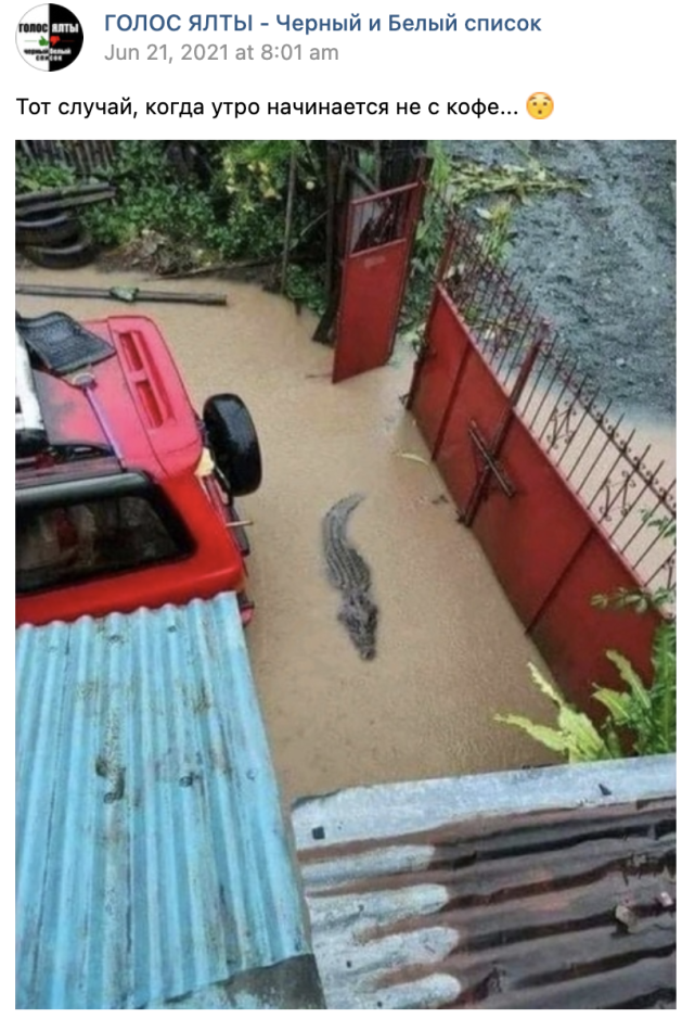 经查证,该视频同样与郑州暴雨无关。它发生地位于墨西哥塔毛利帕斯州的坦皮科,时间是今年6月21日,一女子在河边洗衣时被鳄鱼袭击后身亡。仔细听网传视频,也可以发现视频中的声音并非中文。 实际上,该图至少在一个月以前已经在国外社交网站上传播了,与本次郑州暴雨毫无关系。 一个俄罗斯社交账号在6月21日已经贴出了这张图,所以结论就是,“郑州暴雨海洋馆爆炸,鳄鱼跑出来吃人”也纯属谣言。