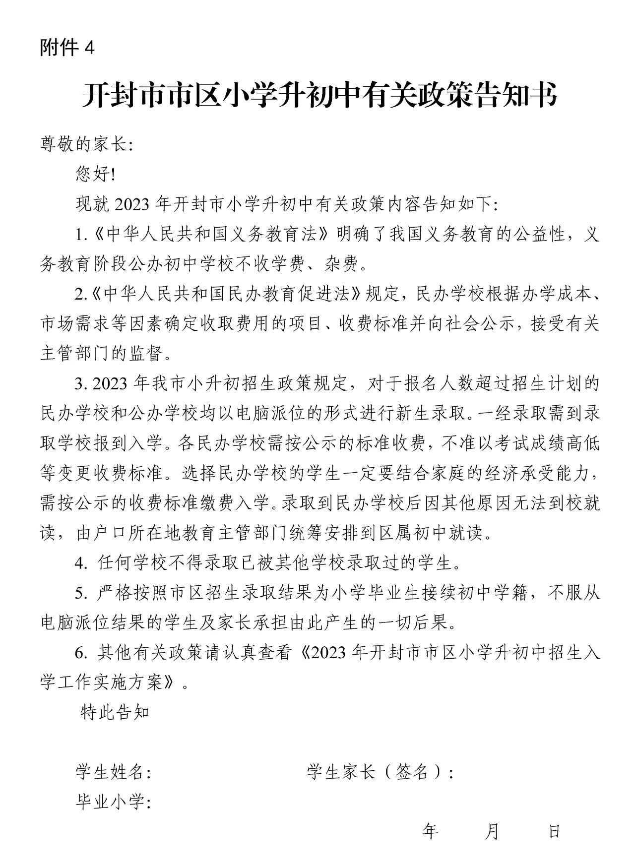 所有参加市区小学升初中的小学毕业生及家长,均需签署《2023年开封市市区小学升初中有关政策告知书》(见附件4)。