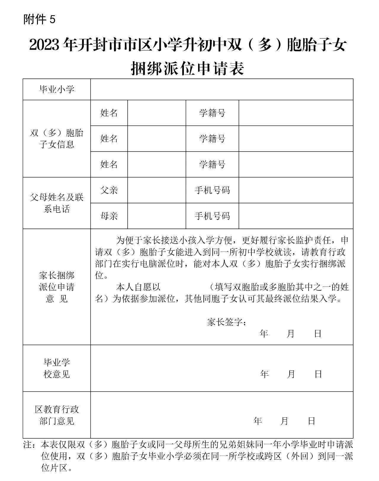 5.2023年开封市市区小学升初中双(多)胞胎子女捆绑派位申请表