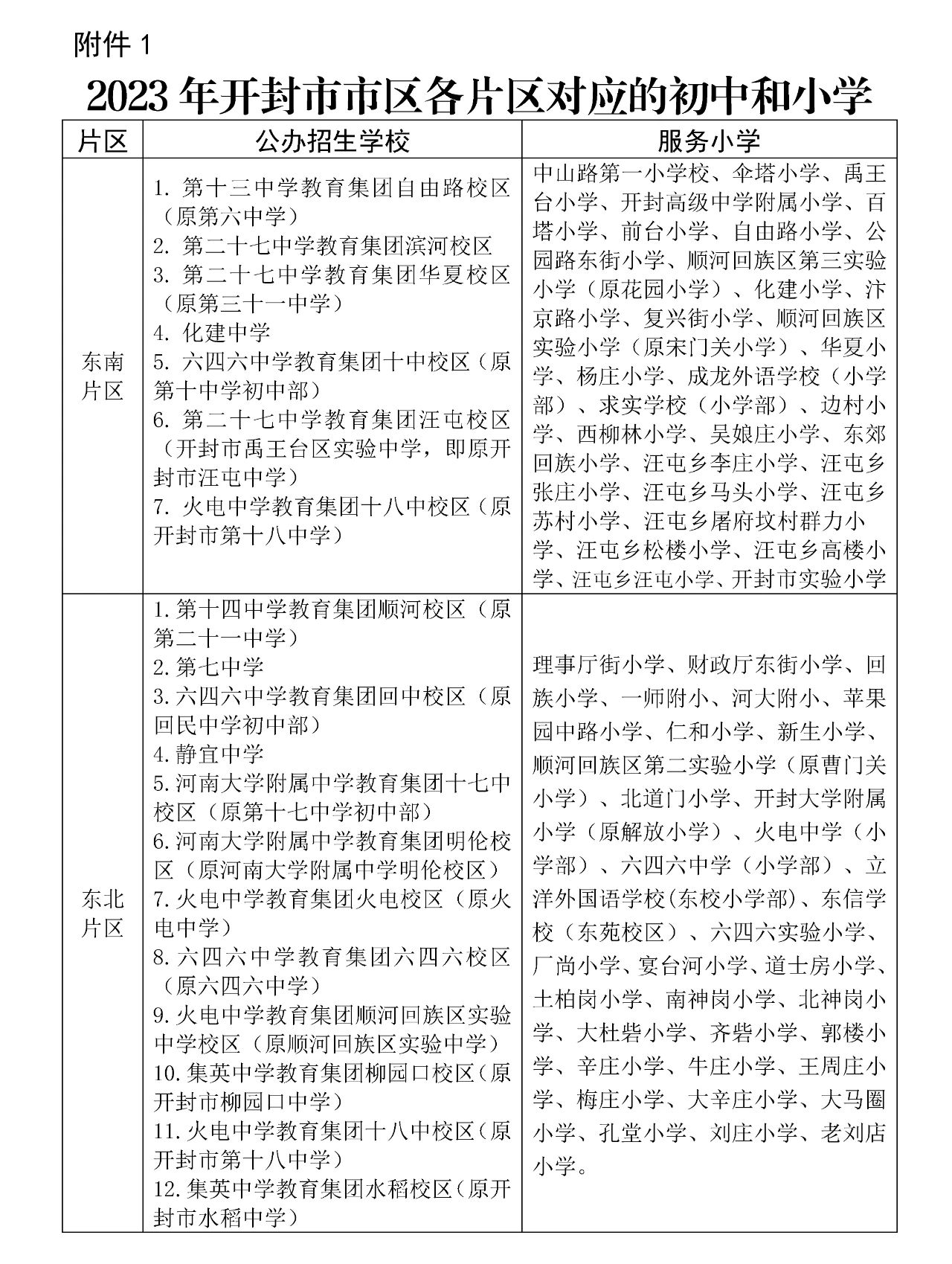 按照初中和小学的相对位置,同时兼顾初中招生计划和小学毕业生人数,将市区划分为四个片区:即东南片区、东北片区、西南片区和西北片区,东西大致以体育场东路→龙亭东路→宋都御街→中山路→五福路→民有街→金梁里街为界,南北大致以汴京路→寺后街→省府西街→丁角街→向阳路→晋安路为界(各片区对应的初中和小学见附件1)。