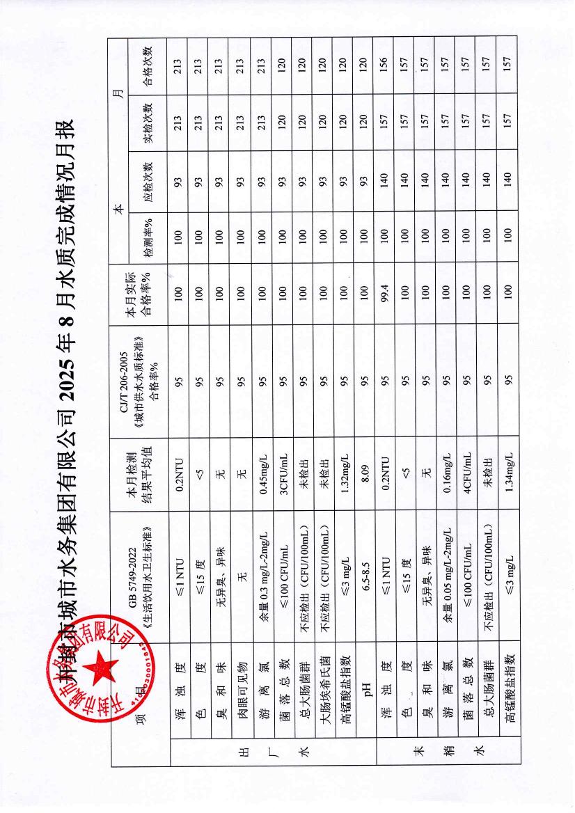 开封市城市水务集团有限公司2025年8月水质完成情况月报