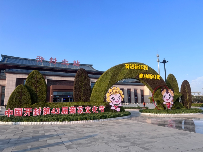 无人机俯瞰市民广场,一幅菊田花海画卷让人惊艳;金明广场转盘处,立体圆形菊雕和《黄河风》雕塑相映成美景;开封火车站站前广场上,大型立体花篮下“菊娃”张开双手迎接四海宾朋……金秋十月,开封遍地金黄,满城花香。