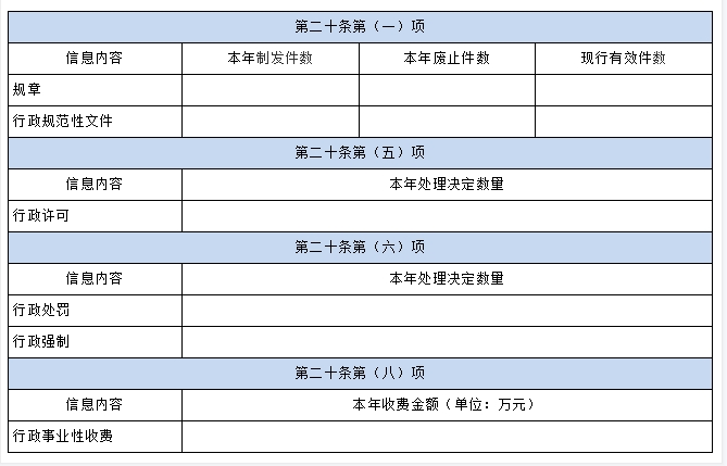 这一项主要报告《中华人民共和国政府信息公开条例》第二十条规定的法定主动公开内容中,适宜以数据方式呈现且具备统计汇总价值的内容,包括(一)(五)(六)(八)共四项,其中,第(五)项的行政许可数量、第(六)项的行政处罚和行政强制数量,包括已公开和依法未公开的全部处理决定。各项数据核定时间点为报告年度的12月31日。