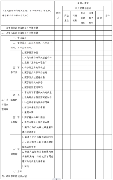 这一项主要报告两方面情况:一是申请人的类别;二是政府信息公开申请的最终处理结果。此项内容重在数据准确、要素齐备,全面客观反映政府信息公开申请接收和办理情况,便于政府信息公开工作主管部门全面掌握工作动态,使社会各界了解政府公开透明进程。