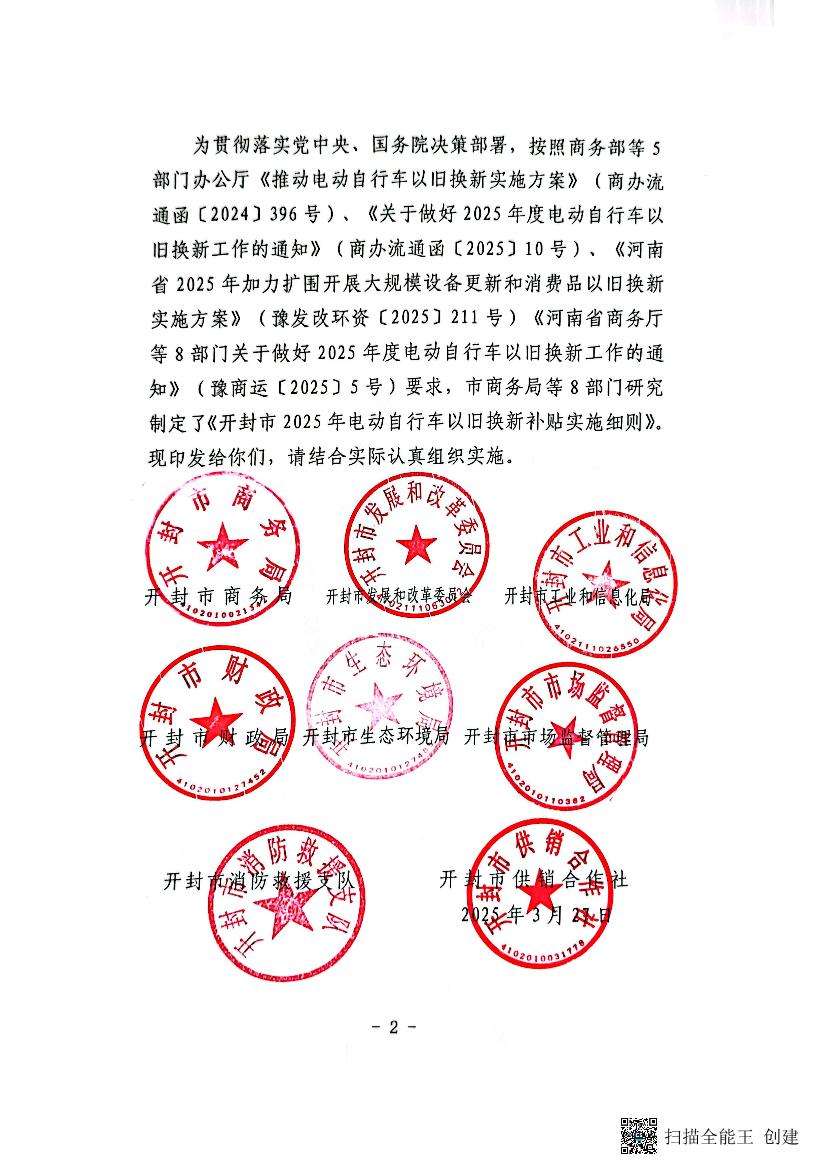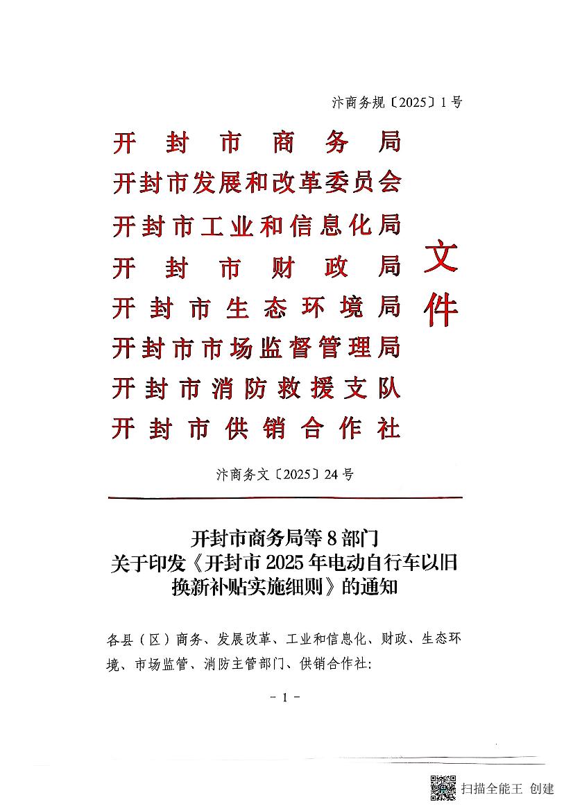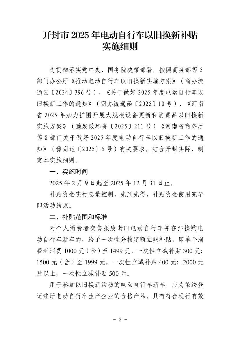 开封市商务局等8部门关于印发《开封市2025年电动自行车以旧换新补贴实施细则》的通知