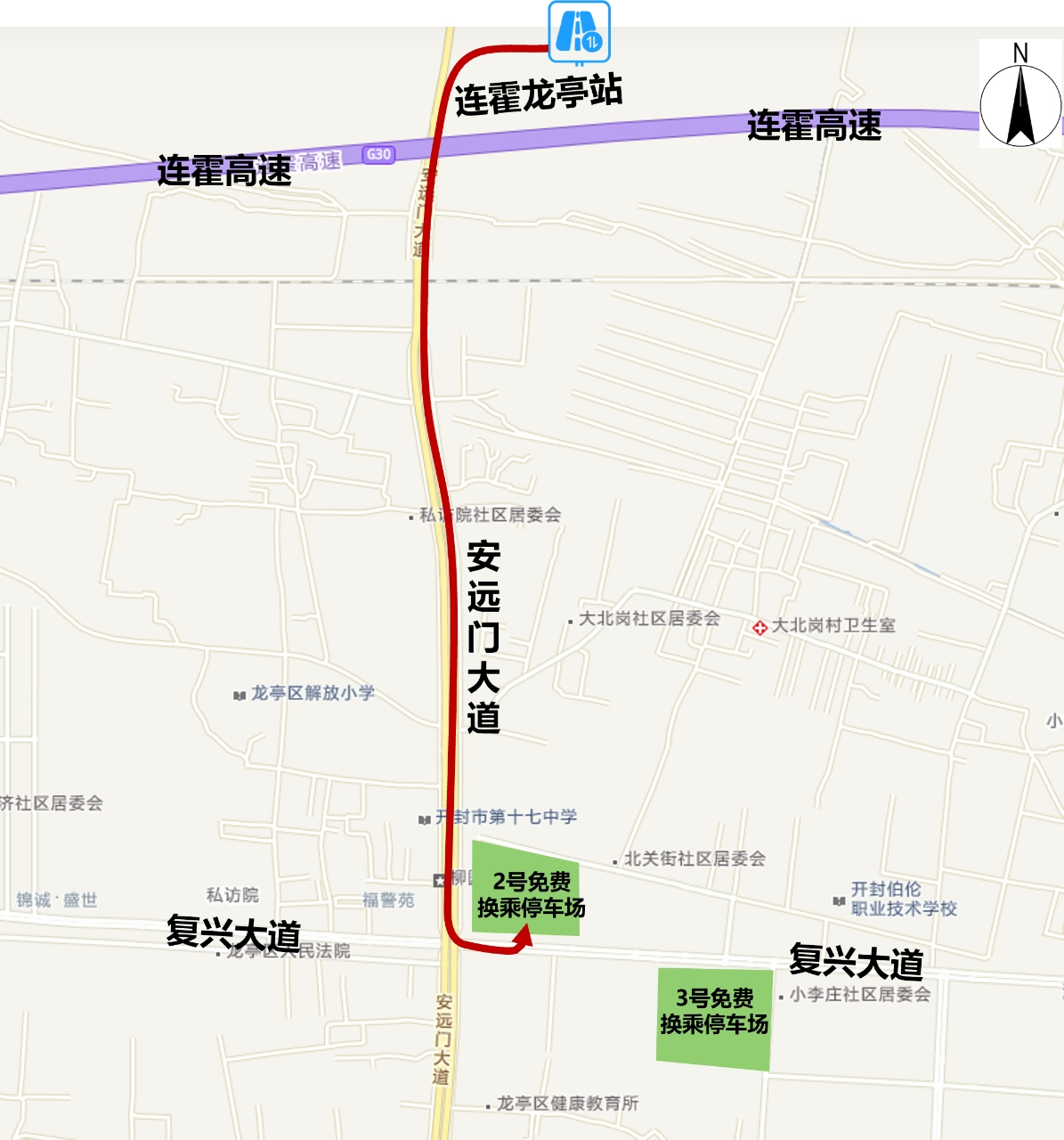 2号免费换乘停车场,位于连霍高速龙亭站向南2000米,安远门大道与复兴大道交口左转向东50米路北,提供小型车位1500个。从连霍高速龙亭站下站小型客车在此停放,乘坐免费换乘公交往返景区。