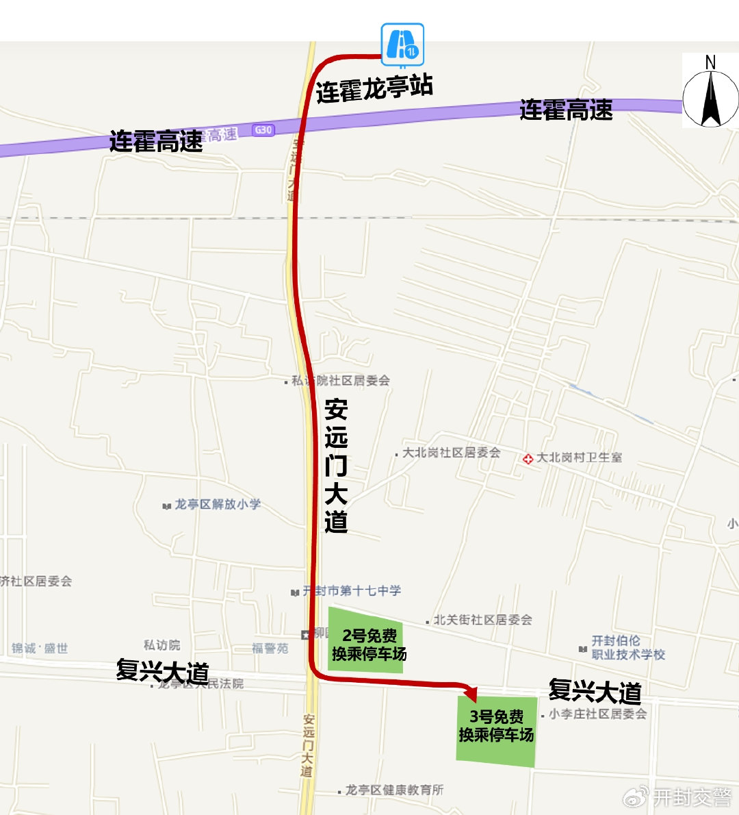 3号免费换乘停车场位于连霍高速龙亭站向南2000米,安远门大道与复兴大道交口左转向东300米路南,提供小型车位2000个。从连霍高速龙亭站下站小型客车可在此停放,乘坐免费换乘公交往返景区。