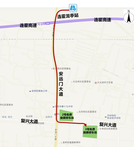 3号免费换乘停车场,位于连霍高速龙亭站向南2000米,安远门大道与复兴大道交叉口左转向东300米路南,提供小型车位2000个。从连霍高速龙亭站下站小型客车也可在此停放,乘坐免费换乘公交往返景区。