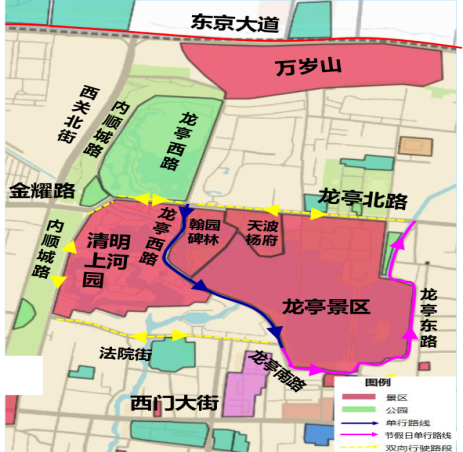 (三)龙亭东路(龙亭南路—龙亭北路),节假日7:00—21:00,实行机动车由南向北单向通行。