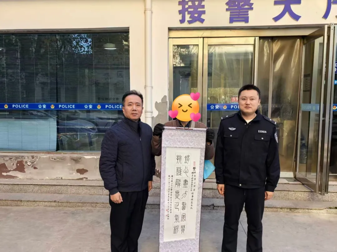 此后,老先生始终惦记着这份承诺。为表达由衷的谢意,他决定不以现成锦旗为礼,而是研墨铺纸,一笔一画写下对民警工作的认可与敬意。历时一年精心准备,终于在今年初冬时节,亲自将这份承载着真挚情谊的书法作品送到刑侦大队。他感慨道:“你们把老百姓的小事当成自己的大事,这样的作风值得点赞!”
