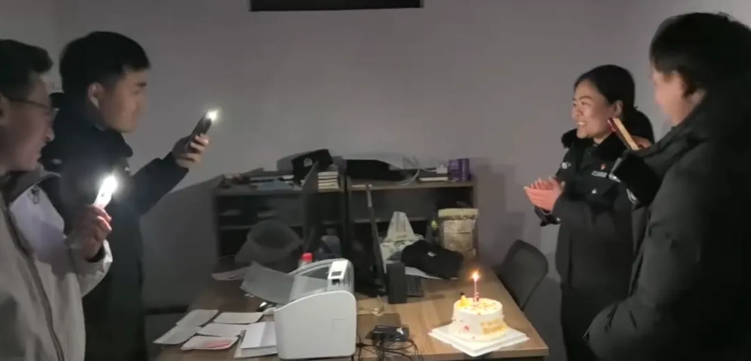 元旦假期的夜晚,铁塔派出所的警灯长明。1月3日凌晨两点,刚处理完一系列警情的民警们,终于有时间聚在一起。一个迟到的生日蛋糕被捧到了带班领导卢文燕面前。没有烛光,手机灯光就是最暖的星光;没有华丽的排场,战友们“燕儿姐生日快乐”“2026顺顺利利”的祝福,就是最珍贵的礼物。