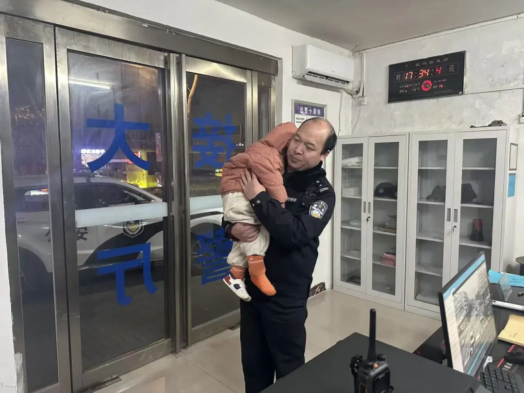 傍晚5点20分,顺河公安分局铁塔派出所接到报警:一名约两岁的幼童独自在龙亭北路边走边哭。民警高俊亮和张琦琛赶到时,孩子鞋子已跑丢,袜子湿透,在寒风中瑟瑟发抖。