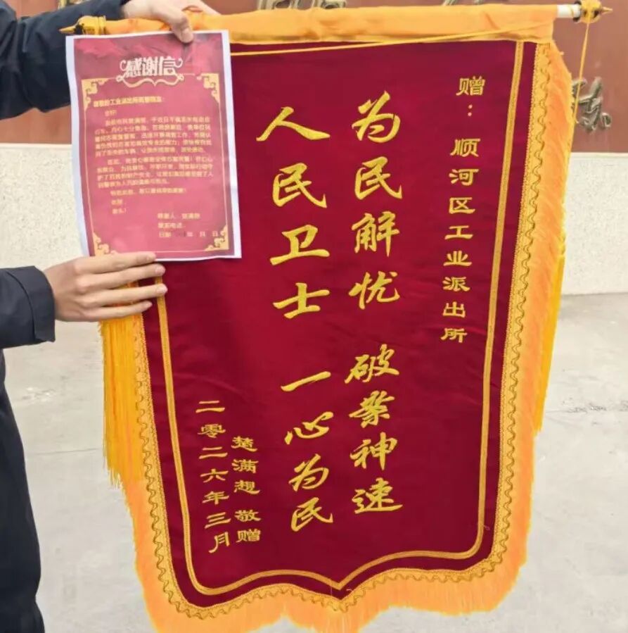 “真是太感谢了!人民公安真是为人民啊!”看着完好无损的爱车,楚女士激动不已,事后特意制作锦旗、写下感谢信送到派出所,用最朴实的话语,表达对民警的最高褒奖。