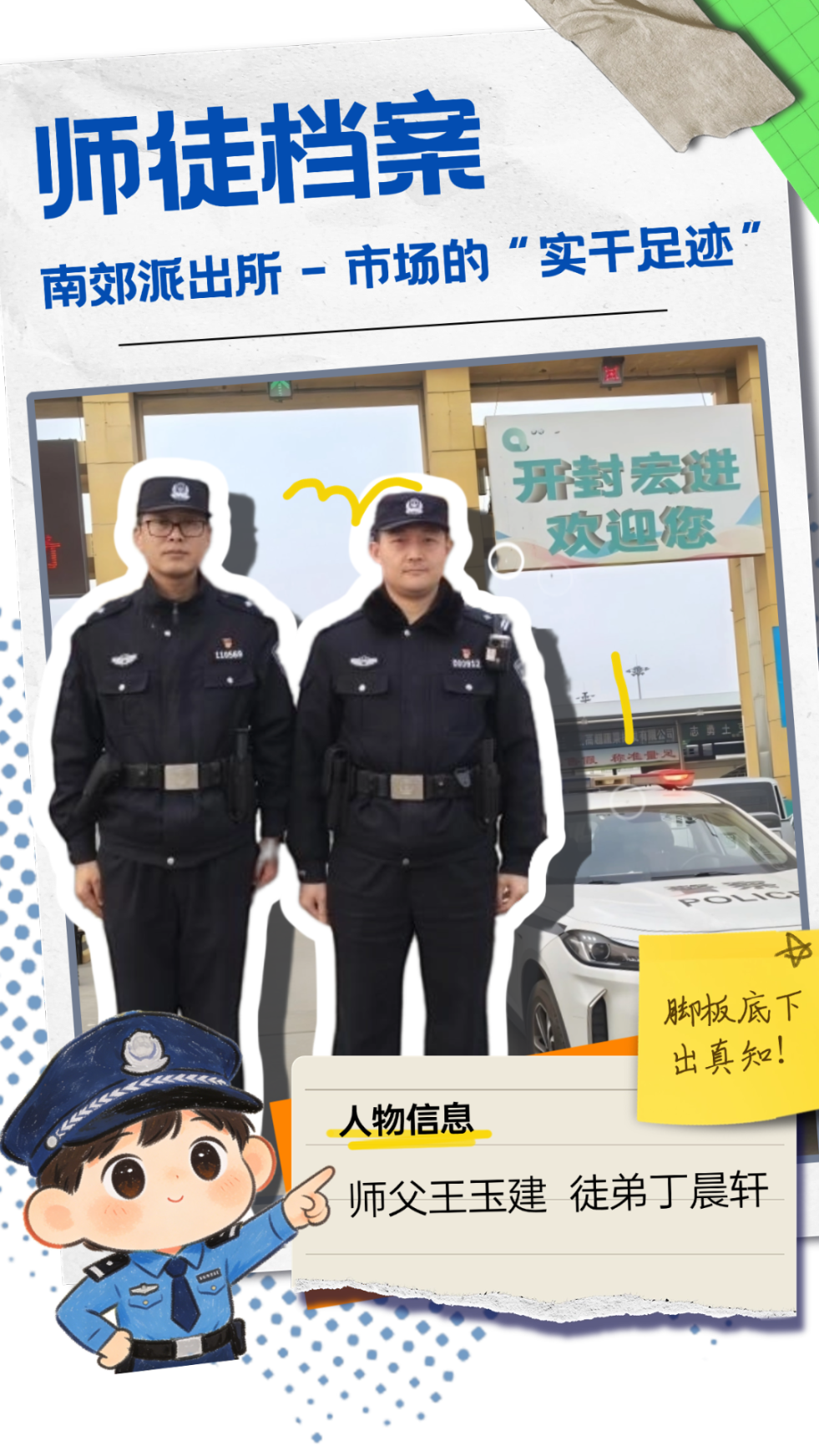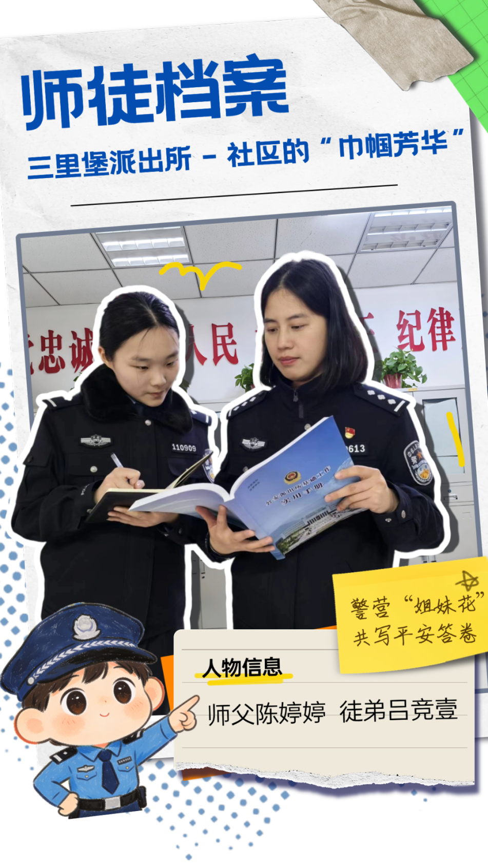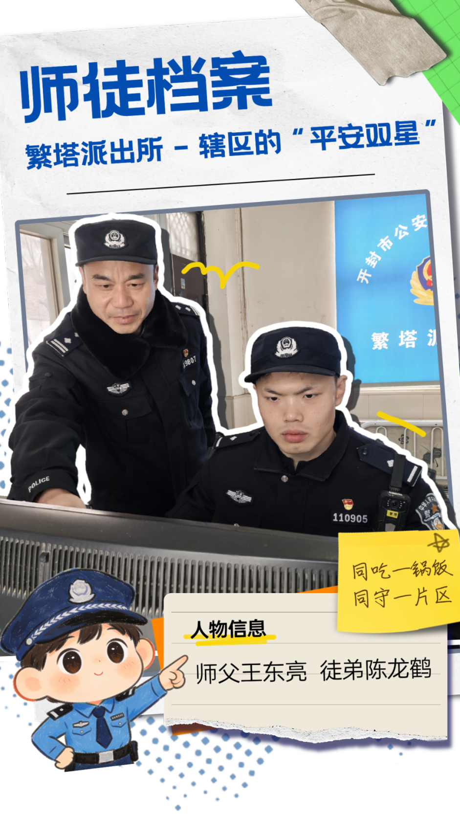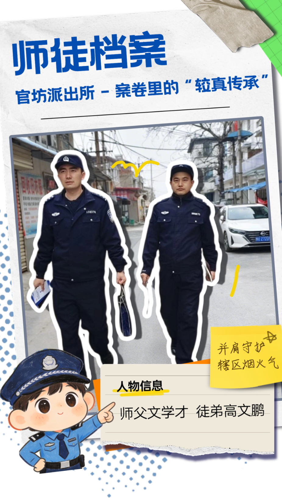 两人同岁,却以师徒相称。从机关到基层,高文鹏跟着师父文学才走街串巷、进店入户,在巡逻防控中熟悉辖区,在排查隐患中积累经验,在防范宣传中拉近群众,也从一起起案件办理中学业务、长本领。这对同龄师徒并肩守护着辖区的烟火气。