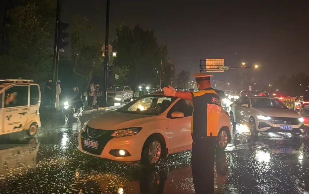 在金明大道连霍高速下站口的一号免费换乘停车场,交警支队六大队副大队长陈方萌正带着铁骑队员疏导车辆,骤雨突至时,他们立刻把警车变成临时避雨所,车门一开,挤满了被淋成 “落汤鸡” 的游客。“大家别着急,等雨小些再走!” 陈方萌的声音混着雨声,却让车内的游客心里暖暖的。