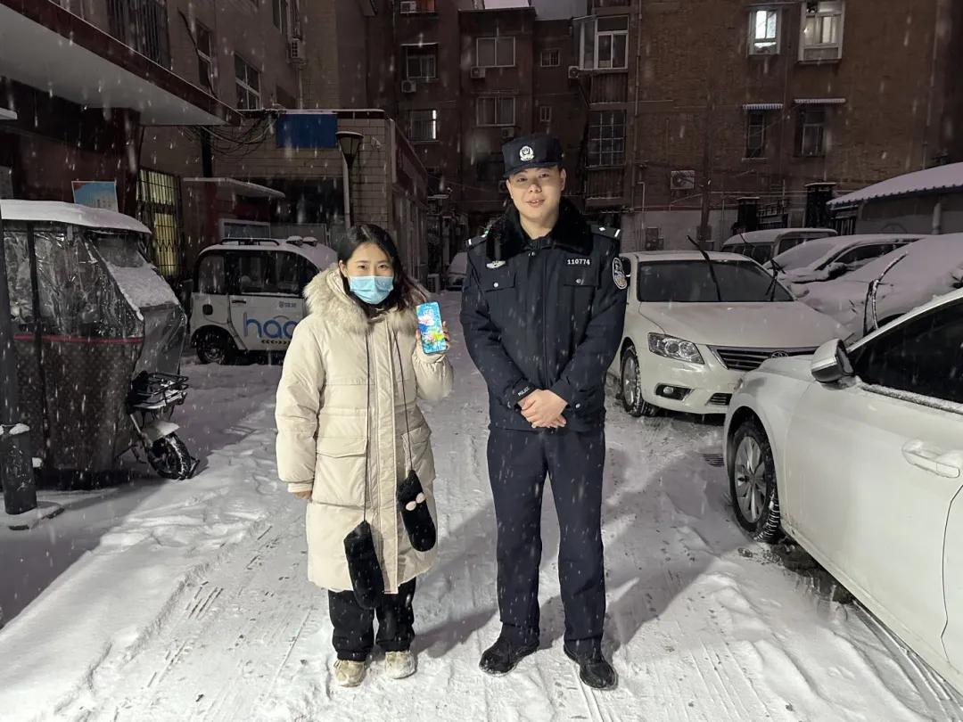 19日晚,大雪纷飞中,一位群众焦急地求助——手机遗失在雪地里。巡逻民警程向冲与同事立刻俯身,沿路仔细搜寻。雪花扑打着脸庞,他们浑然不觉。近半小时后,手机终于从薄雪下被找到。失主连声道谢时,他们只匆匆叮嘱“保管好随身物品”,便转身再度没入风雪,继续巡逻。