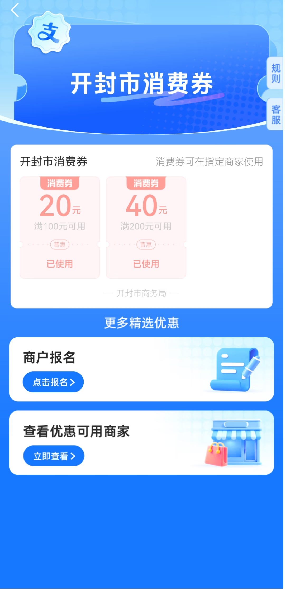 消费券以电子消费券形式发放。消费者可通过支付宝消费券发放平台活动页面进行领取,采用“先领先得,领完为止”的原则。消费券分为“满30元减5元、满50元减10元、满100元减20元、满200元减40元”四种。每人每期最多可领取两张,消费券可在开封市域内的零售、餐饮消费业态使用。