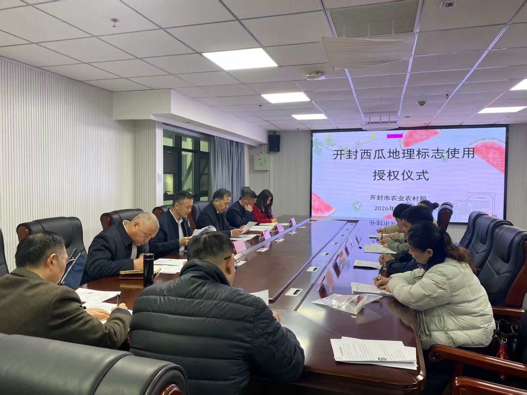 为打造我市农产品特色品牌和城市形象名片,切实提升农产品竞争力,3月25日,开封市农业农村局组织开展“开封西瓜”农产品地理标志授权工作。市农业农村局党组成员、副局长张鹏,局四级调研员李银波及市场信息科、市农业技术推广站、市质量安全中心有关负责同志和专家,尉氏县、示范区3家农业经营主体代表,参加了本次授权仪式。