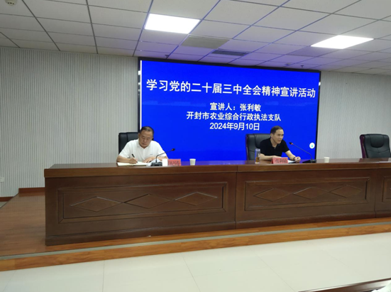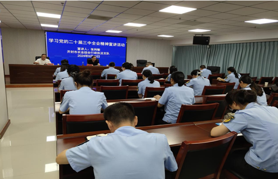 为全面深入学习领会党的二十届三中全会精神,扎实推进学习宣传贯彻工作,引导党员干部把思想和行动统一到党的二十届三中全会精神上来。9月10日,市农业综合行政执法支队邀请驻市农业农村局纪检监察组组长张利敏同志作为宣讲人为支队党员干部开展学习二十届三中全会精神宣讲活动,支队全体人员积极参加,支队总支部书记、支队长张纪涛主持。