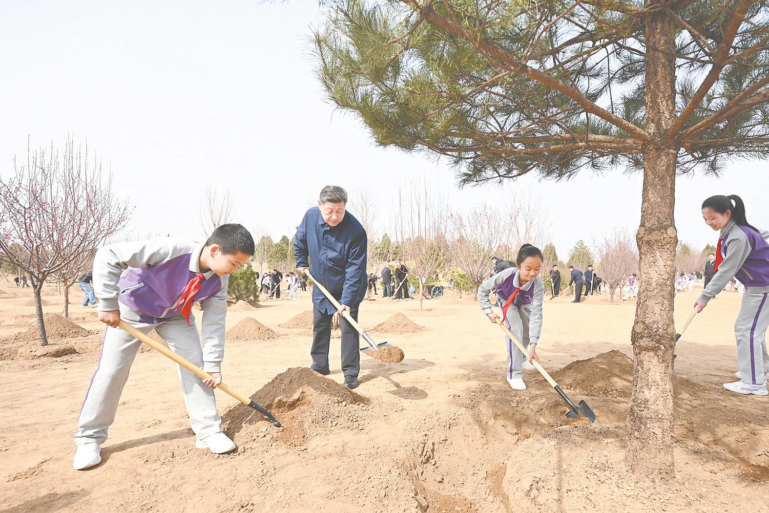 挥锹铲土、培土围堰、提水浇灌……习近平接连种下油松、北京牡丹、榆叶梅、杜仲、元宝枫等多棵树苗。他一边植树,一边询问孩子们的学习生活、劳动锻炼和参加植树情况。习近平强调,青少年像小树苗一样充满活力和希望,要从小树立远大志向,爱知识、爱劳动、爱自然,德智体美劳全面发展,努力成长为栋梁之材。现场气氛热烈,一派繁忙景象。