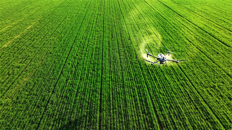 3月20日,洛阳市孟津区白鹤镇,新型无人机正对600亩高标准农田进行农药和除草剂喷洒作业,确保小麦增产丰收。 郑占波 刘芳芳 摄