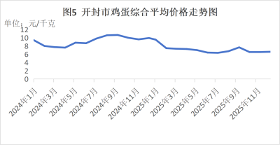 (三)鸡蛋价格下降明显。2025年全年鸡蛋均价为7.1元/千克,同比下降22.8%。鸡蛋价格总体缓慢下滑,但跃幅较大。在供应方面,2025年产蛋鸡存栏量处于高位,鸡蛋产量充足;需求端消费整体偏弱,导致价格承压。一季度,节日效应影响不大,均价8.1元/千克,环比下降17.3%,同比下降3.6%;二季度开始持续下降,均价6.9元/千克,环比下降14.8%;三季度虽有中秋备货需求,但涨幅有限,均价6.9元/千克,环比持平;四季度进入消费淡季,价格进一步下跌,均价6.6元/千克,环比下降4.3%,同比下降32.6%。