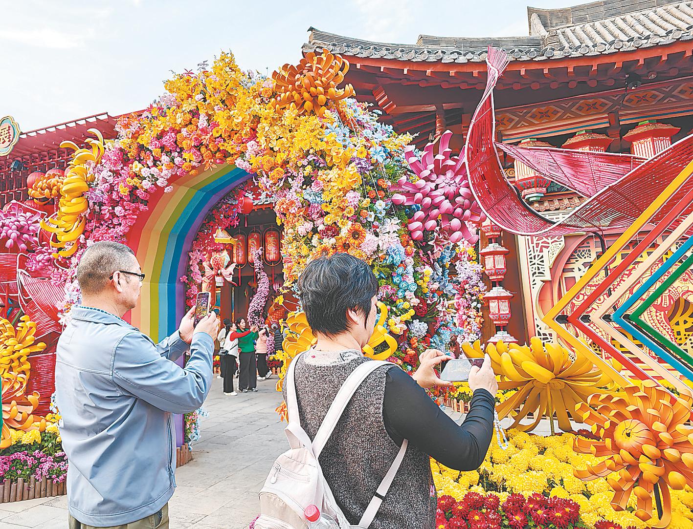 “不是花中偏爱菊,此花开尽更无花。”11月17日,虽然我市气温骤降,但仍挡不住游客前来赏菊的热情,造型别致的景观吸引人们纷纷拍照留念。(记者 袁洋 摄)