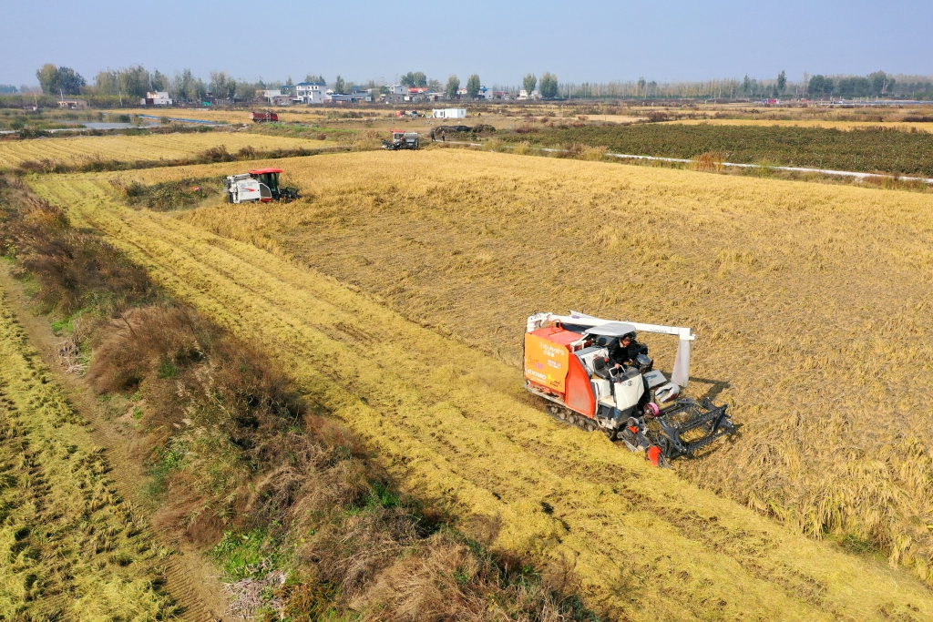 风吹稻谷香,水稻收割忙。11月20日,在城乡一体化示范区水稻乡双河铺社区稻田里,农民抢抓晴好天气收获水稻,确保颗粒归仓,田野一派繁忙景象。(记者 石斐 摄)