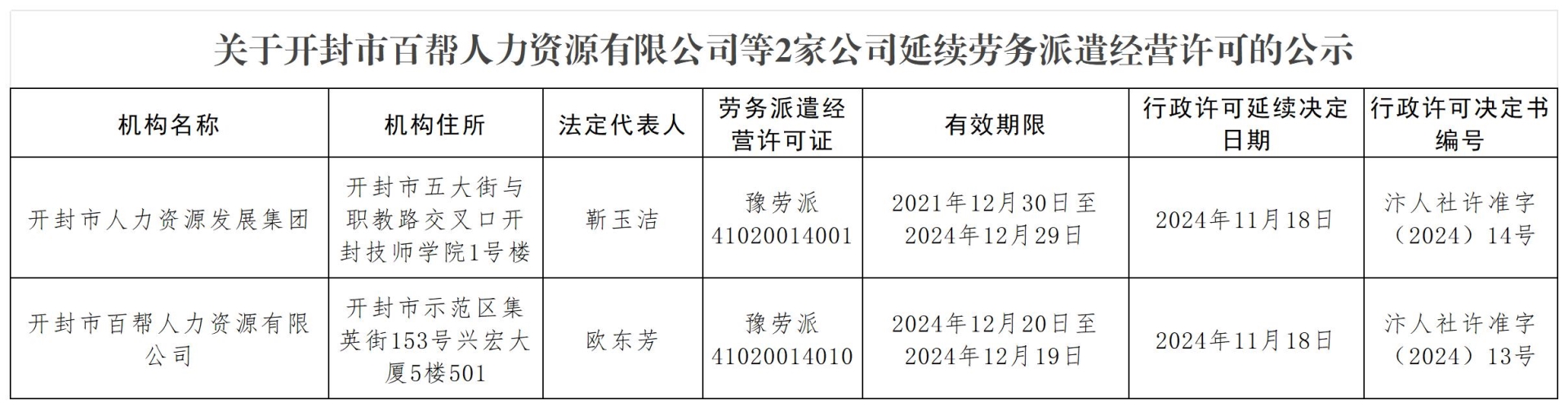 关于开封市百帮人力资源有限公司等2家公司延续劳务派遣经营许可的公示