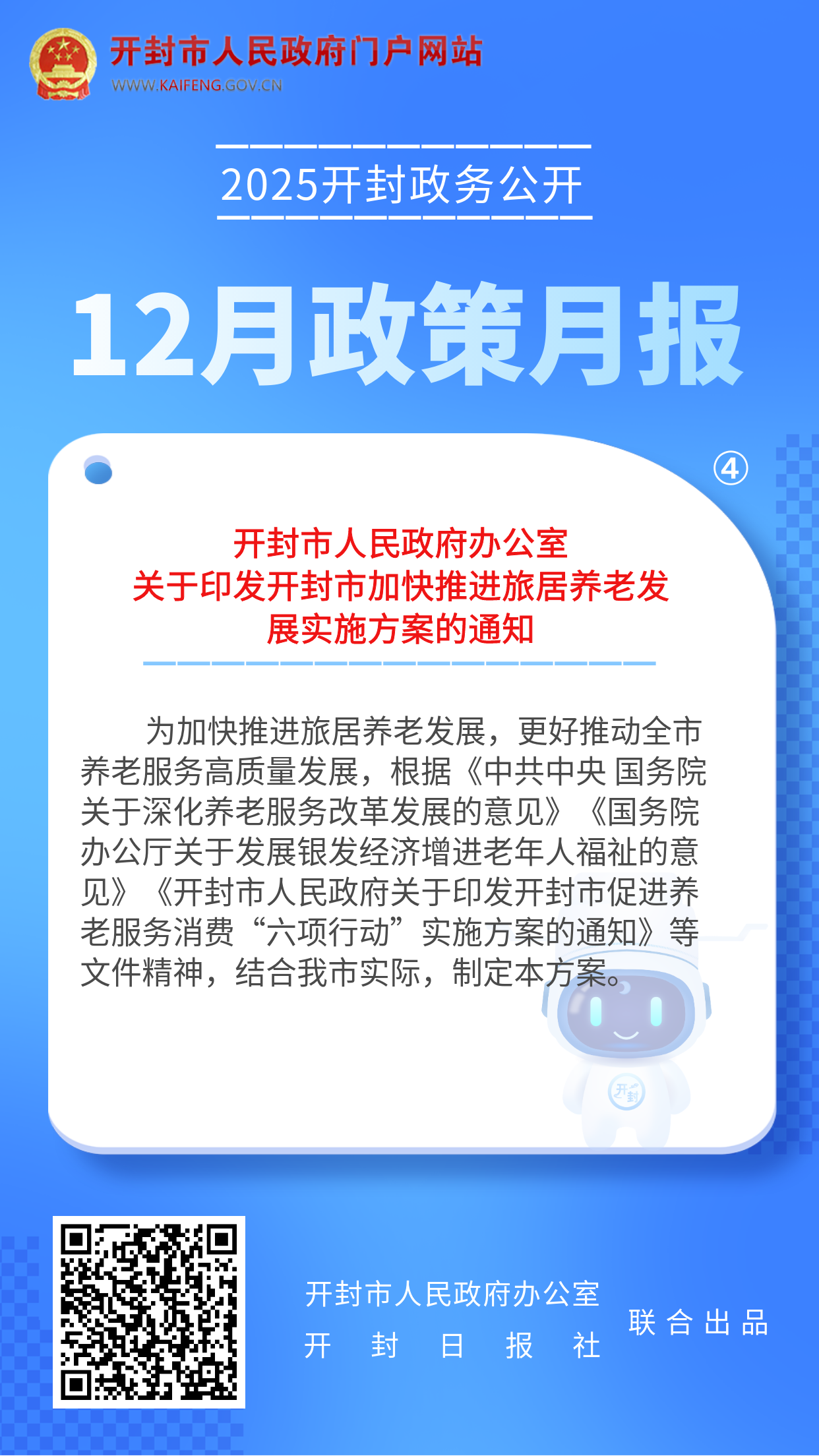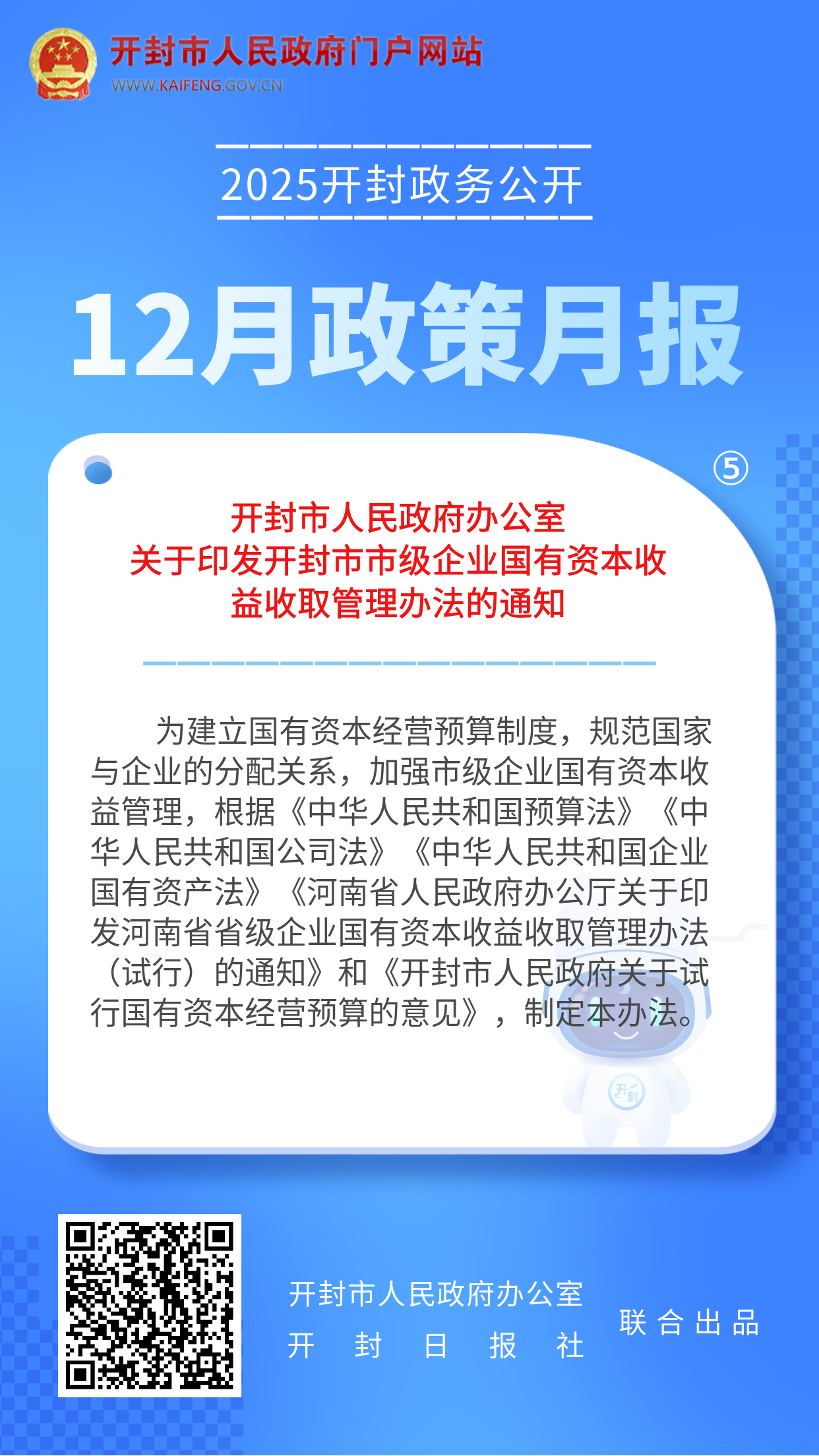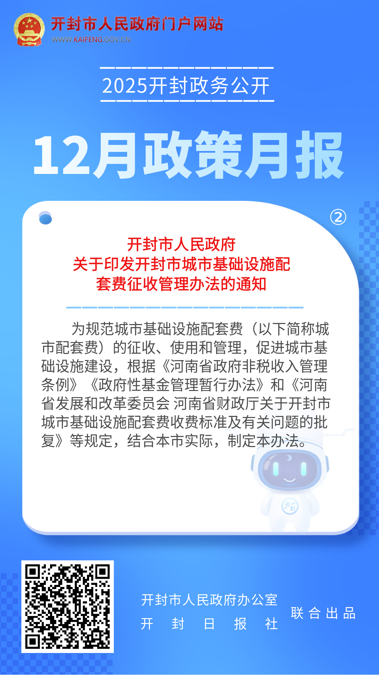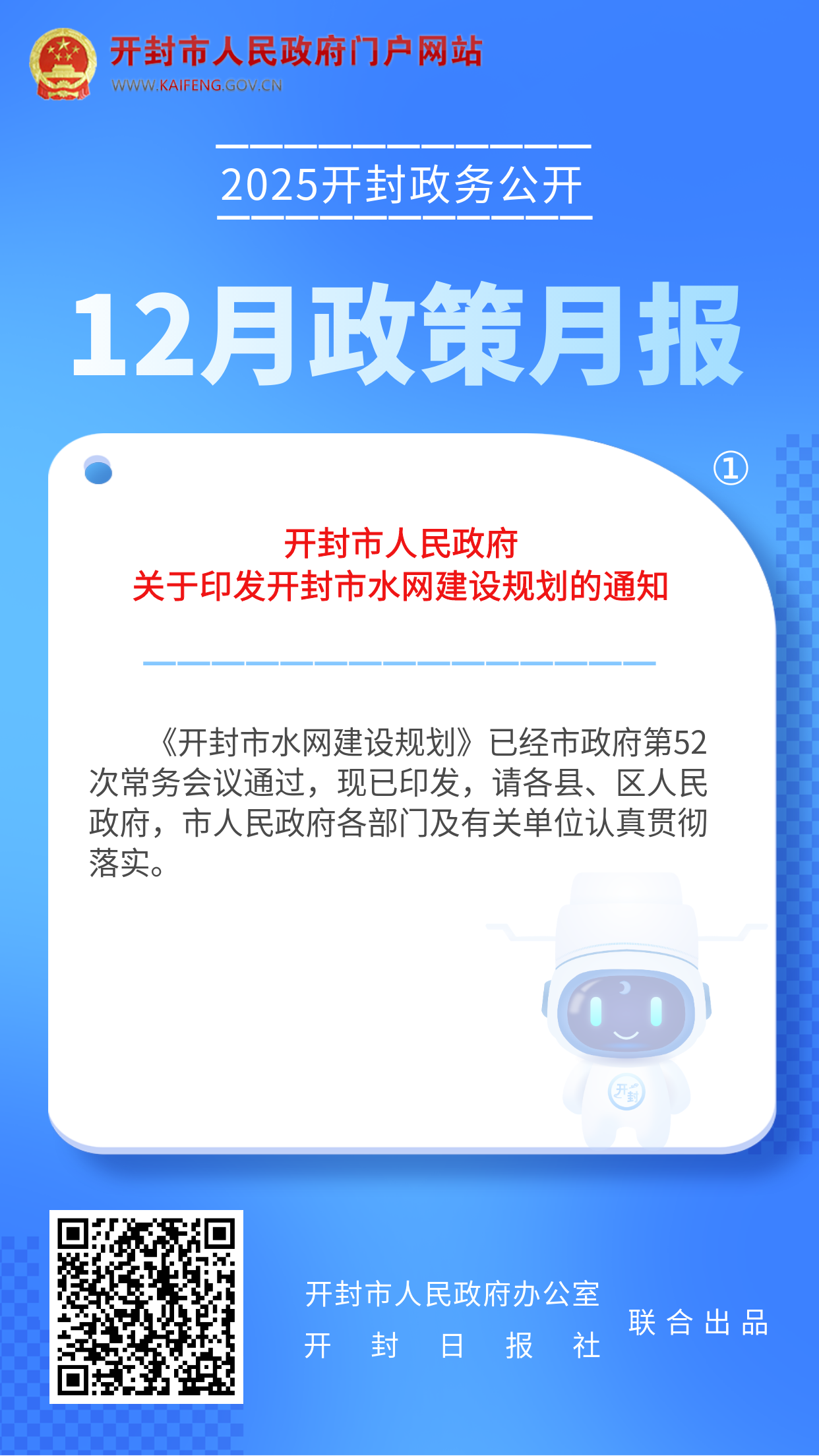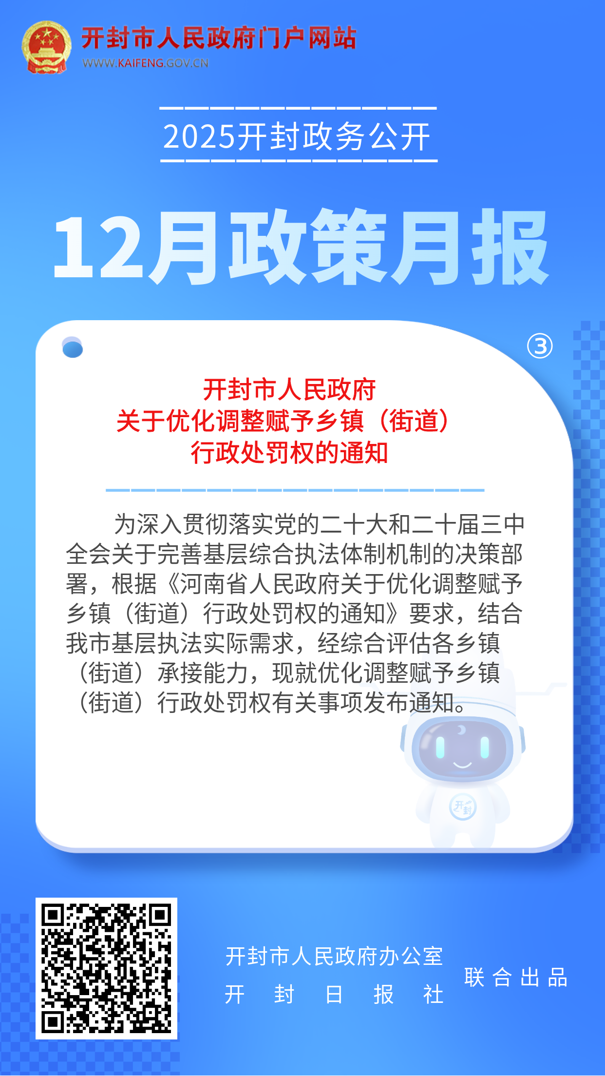 2025年12月,开封市人民政府发布了关于印发开封市水网建设规划的通知、关于印发开封市城市基础设施配套费征收管理办法的通知、关于优化调整赋予乡镇(街道)行政处罚权的通知;开封市人民政府办公室发布了关于印发开封市加快推进旅居养老发展实施方案的通知、关于印发开封市市级企业国有资本收益收取管理办法的通知等,一起来看详情: