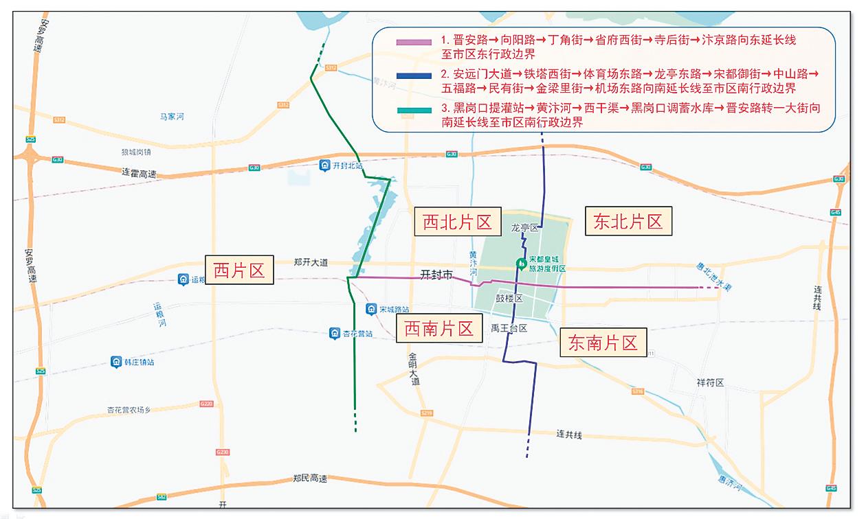 黑岗口提灌站→黄汴河→西干渠→黑岗口调蓄水库→晋安路转一大街向南延长线至市区南行政边界以东区域:东西以安远门大道→铁塔西街→体育场东路→龙亭东路→宋都御街→中山路→五福路→民有街→金梁里街→机场东路向南延长线至市区南行政边界为界,南北以晋安路→向阳路→丁角街→省府西街→寺后街→汴京路向东延长线至市区东行政边界为界,划分为东南片区、东北片区、西北片区、西南片区。