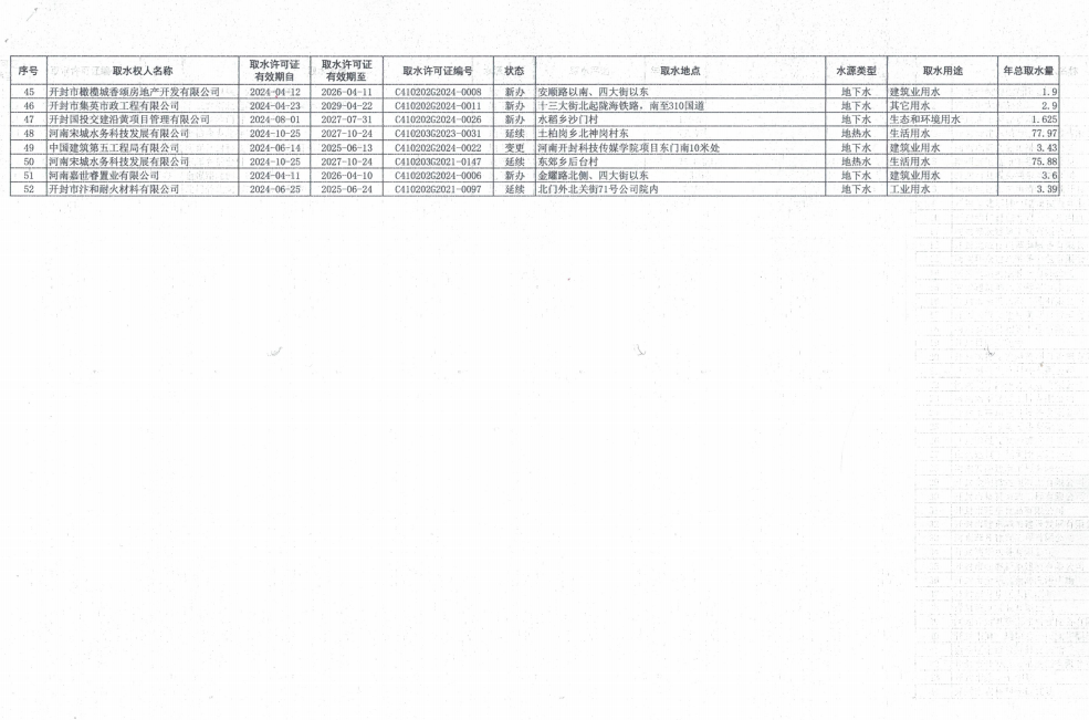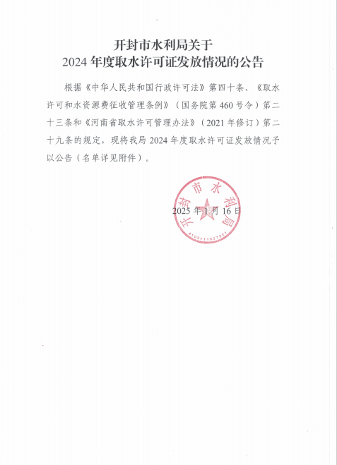 开封市水利局关于2024年度取水许可证发放情况的公告