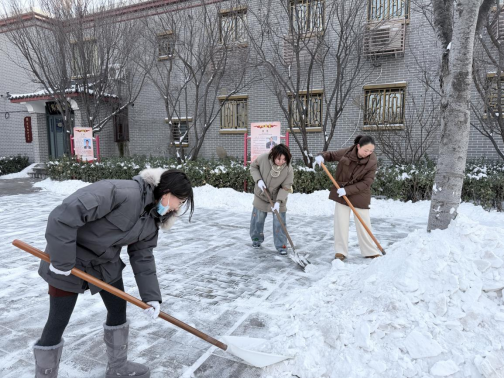 寒风中,员工们化身“破冰卫士”,迅速集结奋战一线。大家不畏严寒、分工协作,有的破冰铲雪开辟通道,有的细致清扫残雪,有的温馨提醒过往市民注意安全,现场干劲十足。