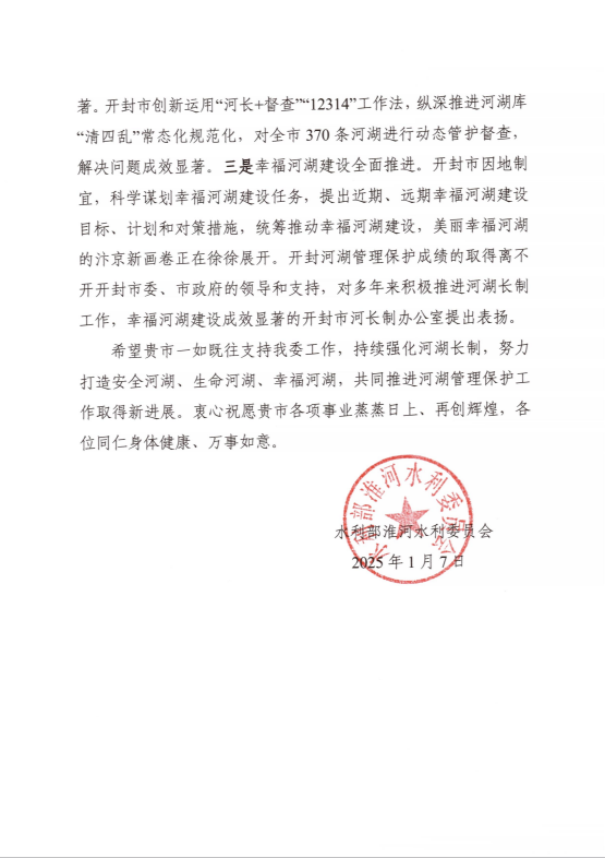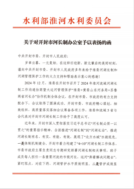 近日,水利部淮河水利委员会向开封河长制办公室市发来一封表扬函,对多年来积极推进河湖长制工作,幸福河湖建设成效显著开封市河长制办公室提出表扬。