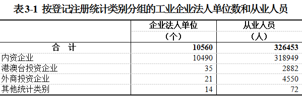在工业企业法人单位从业人员中,内资企业31.89万人,占97.7%;港澳台投资企业0.29万人,占0.9%;外商投资企业0.46万人,占1.4%(详见表3-1)。