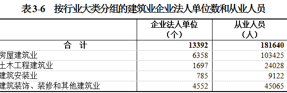 在建筑业企业法人单位中,房屋建筑业占47.5%,土木工程建筑业占12.7%,建筑安装业占5.9%,建筑装饰、装修和其他建筑业占34.0%。在建筑业企业法人单位从业人员中,房屋建筑业占57.0%,土木工程建筑业占13.2%,建筑安装业占5.0%,建筑装饰、装修和其他建筑业占24.8%(详见表3-6)。
