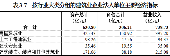 2023年末,全市建筑业企业法人单位资产总计630.80亿元;负债合计306.21亿元。2023年,全市建筑业企业法人单位全年实现营业收入739.73亿元(详见表3-7)。