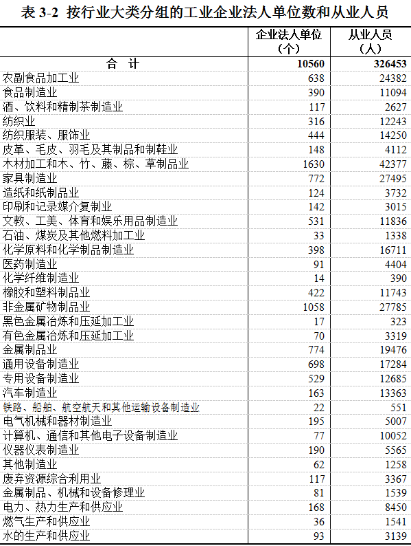 在工业企业法人单位从业人员中,制造业31.33万人,电力、热力、燃气及水生产和供应业1.31万人,分别占96.0%和4.0%。在工业行业大类中,木材加工和木、竹、藤、棕、草制品业,非金属矿物制品业,家具制造业从业人员数位居前三位,分别占13.0%、8.5%和8.4%(详见表3-2)。