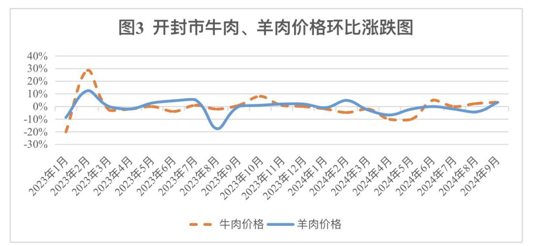 (二)牛羊肉市场供应充足,牛肉价格小幅波动,羊肉价格以降为主。今年以来,牛羊肉价格下跌,主要原因是供给持续增长、消费需求增长趋缓。上半年,牛羊肉市场在猪肉、鸡蛋等低价货源持续冲击下,价格持续下降。4月份价格下降幅度有所扩大,月度环比降幅分别为10.1%、6.7%。6月份以来,牛羊肉市场需求呈先弱后强态势,7-8月份天气炎热,属于肉类消费淡季,需求较为稳定。9月份之后,随着天气逐步转凉,在“中秋”节日效应拉动作用下,牛羊肉市场需求迎来旺季,价格小幅回升。前三季度,牛肉、羊肉平均零售价格分别为60.6元/千克、65.4元/千克,同比分别下降9.0%、7.9%。