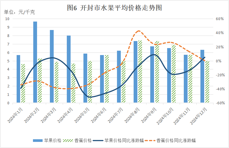 2024年苹果、香蕉全年均价分别为6.9元/千克、5.6元/千克,同比分别下降20.7%、12.5%。香蕉价格下降主要由于市场供应充足。国内主产区香蕉供应增多,且进口香蕉量也同时增加,而市场需求相对平淡,整体处于供大于求的状态,促使香蕉价格逐渐下滑。苹果价格低主要由于:一是供应增加。2024年新季苹果,没有出现严重的天气扰动,苹果产量增加,供应量也随之增加。同时,库存苹果仍有存量,与新季苹果一同供应市场,拉低价格。二是需求减弱。时令水果的大量上市,消费者对苹果的需求量相对减少。三是质量差异。2024年苹果质量整体表现不佳,导致市场上中等及偏下质量货源占比较大,价格明显下滑。