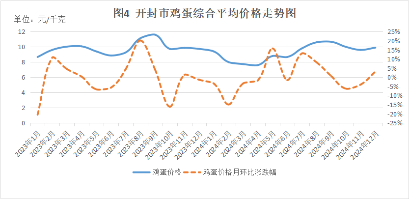 2024年以来,鸡蛋价格前四个月逐月缓慢下滑,5月份逆势上扬,10月份回落。春节后新产蛋鸡数量较多,产蛋量增加,鸡蛋市场供应充足。一季度,鸡蛋均价7.4元/千克,环比下降14.3%,同比下降10.6%。5月临近端午节,鸡蛋消费增强,零售商备货积极,使得鸡蛋的销售速度加快,对蛋价形成了支撑。二季度鸡蛋均价7.4元/千克,环比持平,同比下降10.6%。三季度,高温天气导致鸡蛋价格上涨,鸡蛋均价10.4元/千克,环比上涨23.8%,同比下降1.9%。四季度鸡蛋价格保持小幅波动,鸡蛋均价9.8元/千克,环比下降5.8%,同比上涨1.0%。
