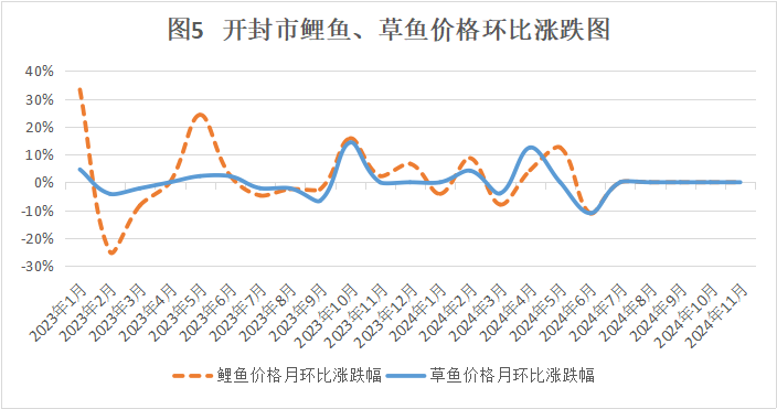 监测的两种淡水鱼价格中,鲤鱼、草鱼2024年全年均价分别为16.1元/千克、16.4元/千克。上半年呈现季节性小幅波动,而7月以后平稳运行。主要原因是市场需求相对稳定,消费者对鲤鱼、草鱼的购买量没有大幅波动。同时,养殖户的出鱼节奏也相对稳定,没有出现集中大量上市或供应短缺的情况。