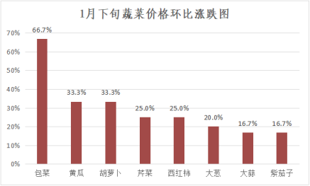 蔬菜价格环比“8升5平”。其中,包菜5元/kg、黄瓜8元/kg、胡萝卜4元/kg、芹菜5元/kg、西红柿5元/kg、大葱6元/kg、大蒜14元/kg、紫茄子7元/kg,分别较中旬上涨66.7%、33.3%、33.3%、25.0%、25.0%、20.0%、16.7%、16.7%;大白菜1.2元/kg、土豆4元/kg,白萝卜1.6元/kg、平菇7元/kg、生姜14元/kg,与中旬价格持平。
