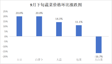 蔬菜价格环比“4升1降8平”。其中,土豆3.6元/kg、白萝卜2.4元/kg、大蒜8元/kg、包菜4元/kg,分别较中旬上涨20.0%、20.0%、14.3%、11.1%;大白菜3元/kg,较中旬下降16.7%;西红柿5元/kg、黄瓜5元/kg、平菇10元/kg、大葱3元/kg、紫茄子3元/kg、生姜13元/kg、芹菜5元/kg、胡萝卜3元/kg,与中旬价格持平。
