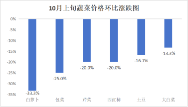 蔬菜价格环比“6降7平”。其中,白萝卜1.6元/kg、包菜3元/kg、芹菜4元/kg、西红柿4元/kg、土豆3元/kg、大白菜2.6元/kg,分别较9月下旬下降33.3%、25.0%、20.0%、20.0%、16.7%、13.3%;黄瓜5元/kg、平菇10元/kg、紫茄子3元/kg、大葱3元/kg、大蒜8元/kg、胡萝卜3元/kg、生姜13元/kg,与9月下旬价格持平。