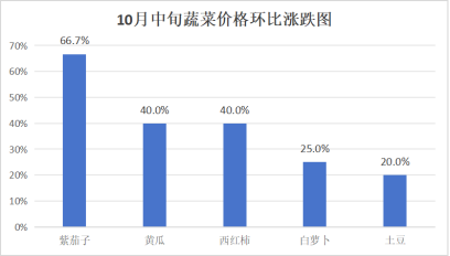 蔬菜价格环比“5升8平”。其中,紫茄子5元/kg、黄瓜7元/kg、西红柿5.6元/kg、白萝卜2元/kg、土豆3.6元/kg,分别较上旬上涨66.7%、40.0%、40.0%、25.0%、20.0%;