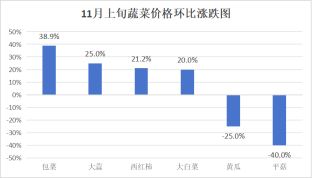 蔬菜价格环比“2降4升7平”。其中,平菇6元/kg、黄瓜6元/kg,分别较10月下旬下降40.0%、25.0%;包菜5元/kg、大蒜10元/kg、西红柿8元/kg、大白菜3.6元/kg,分别较10月下旬上涨38.9%、25.0%、21.2%、20.0%;白萝卜2元/kg、芹菜6元/kg、土豆3.6元/kg、紫茄子7元/kg、大葱3元/kg、胡萝卜3元/kg、生姜13元/kg,与10月下旬价格持平。